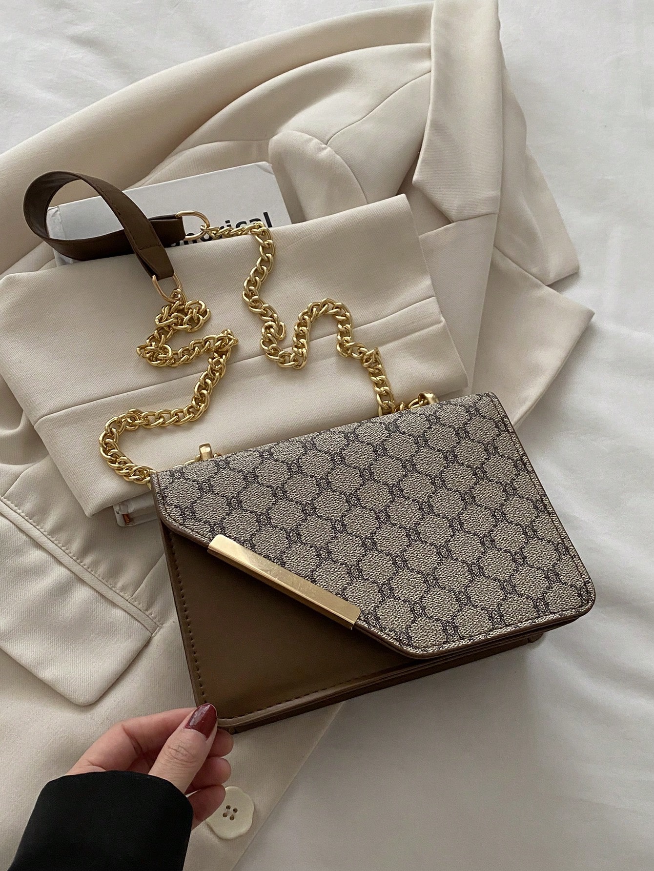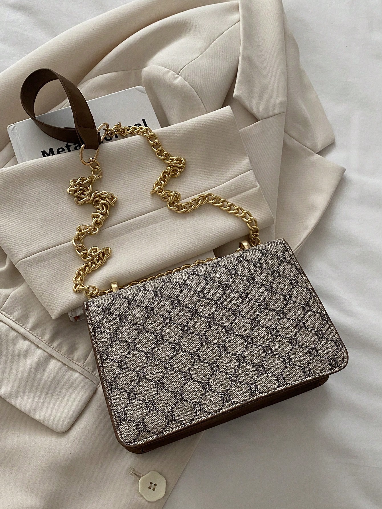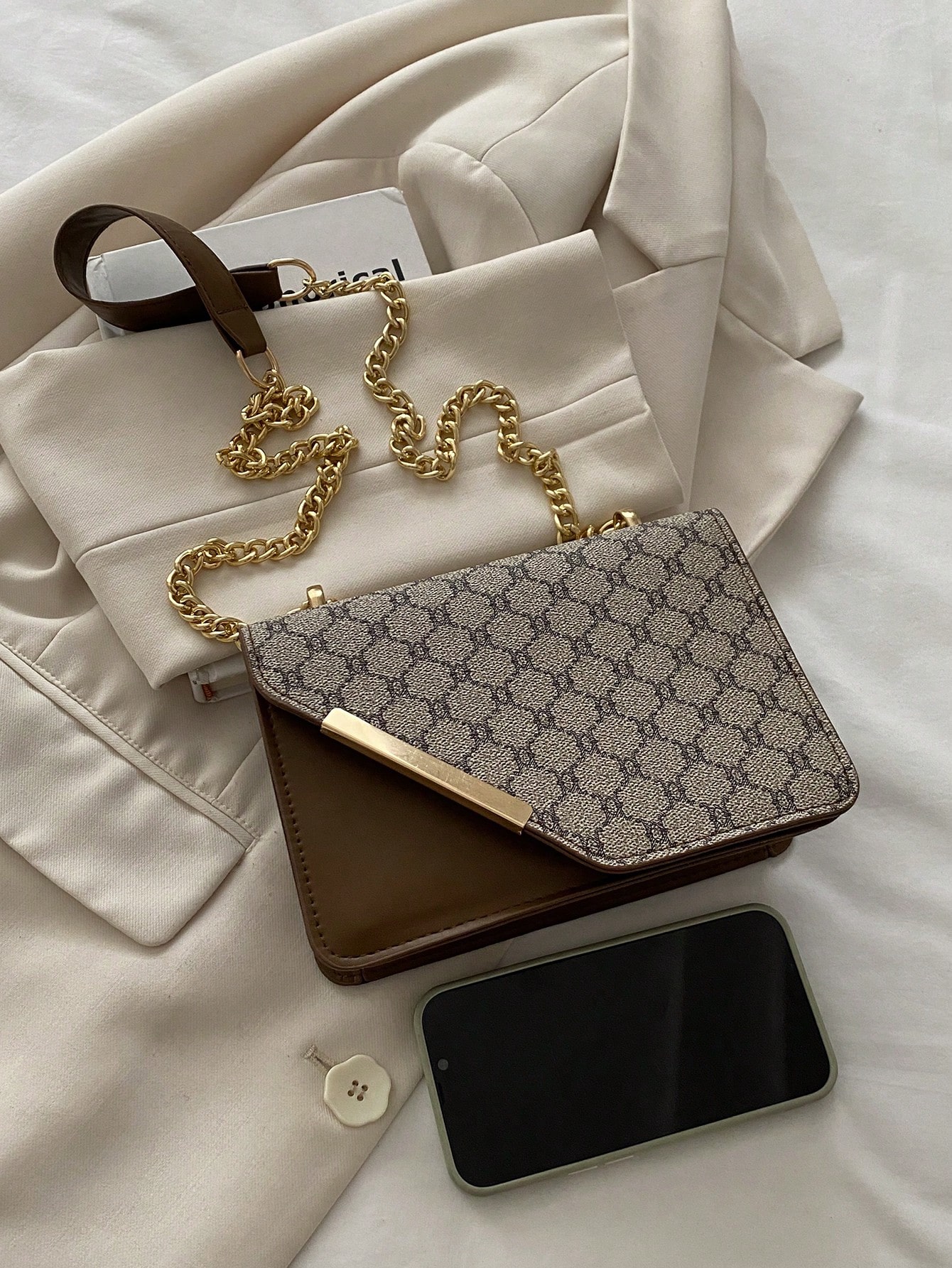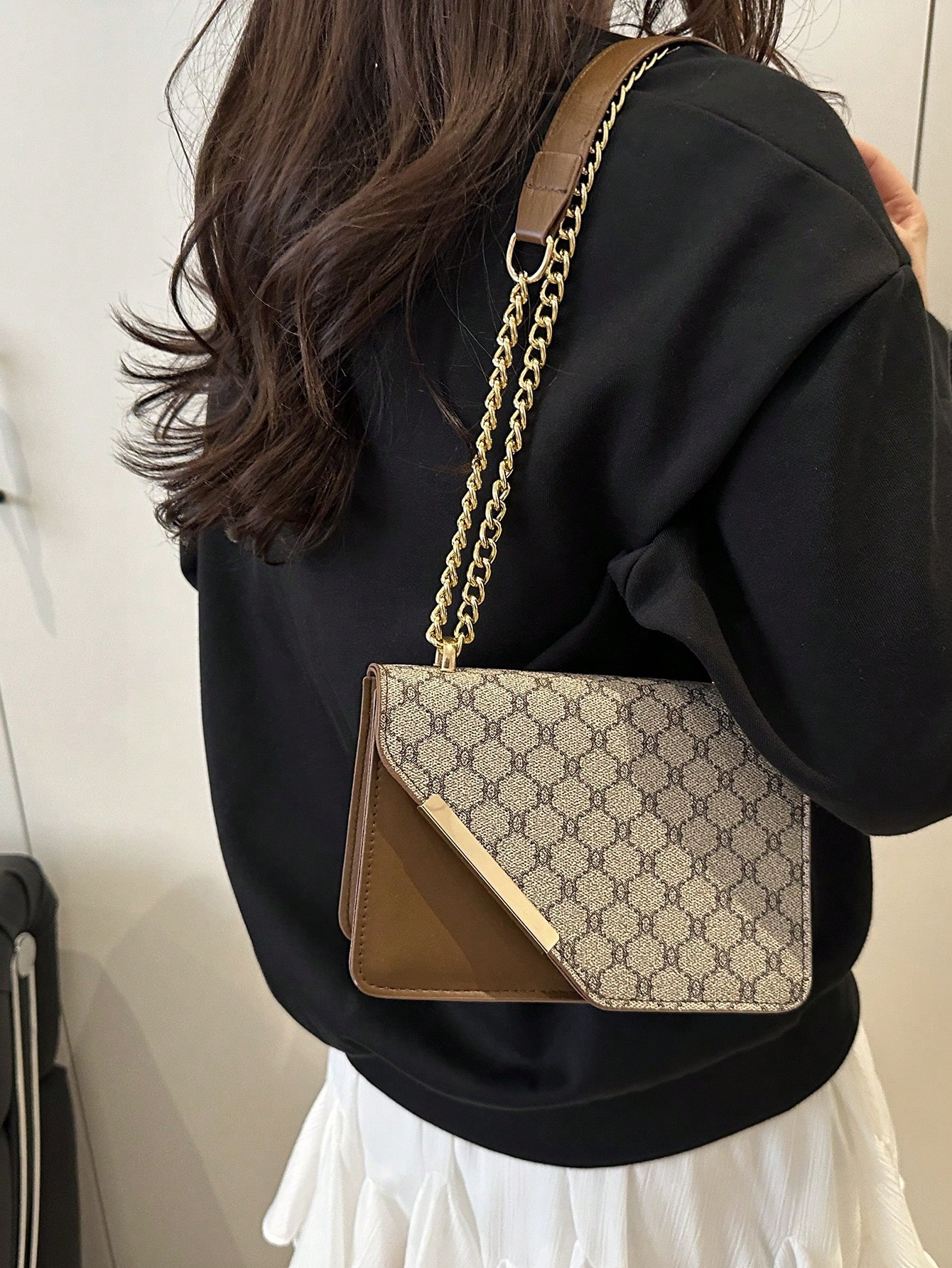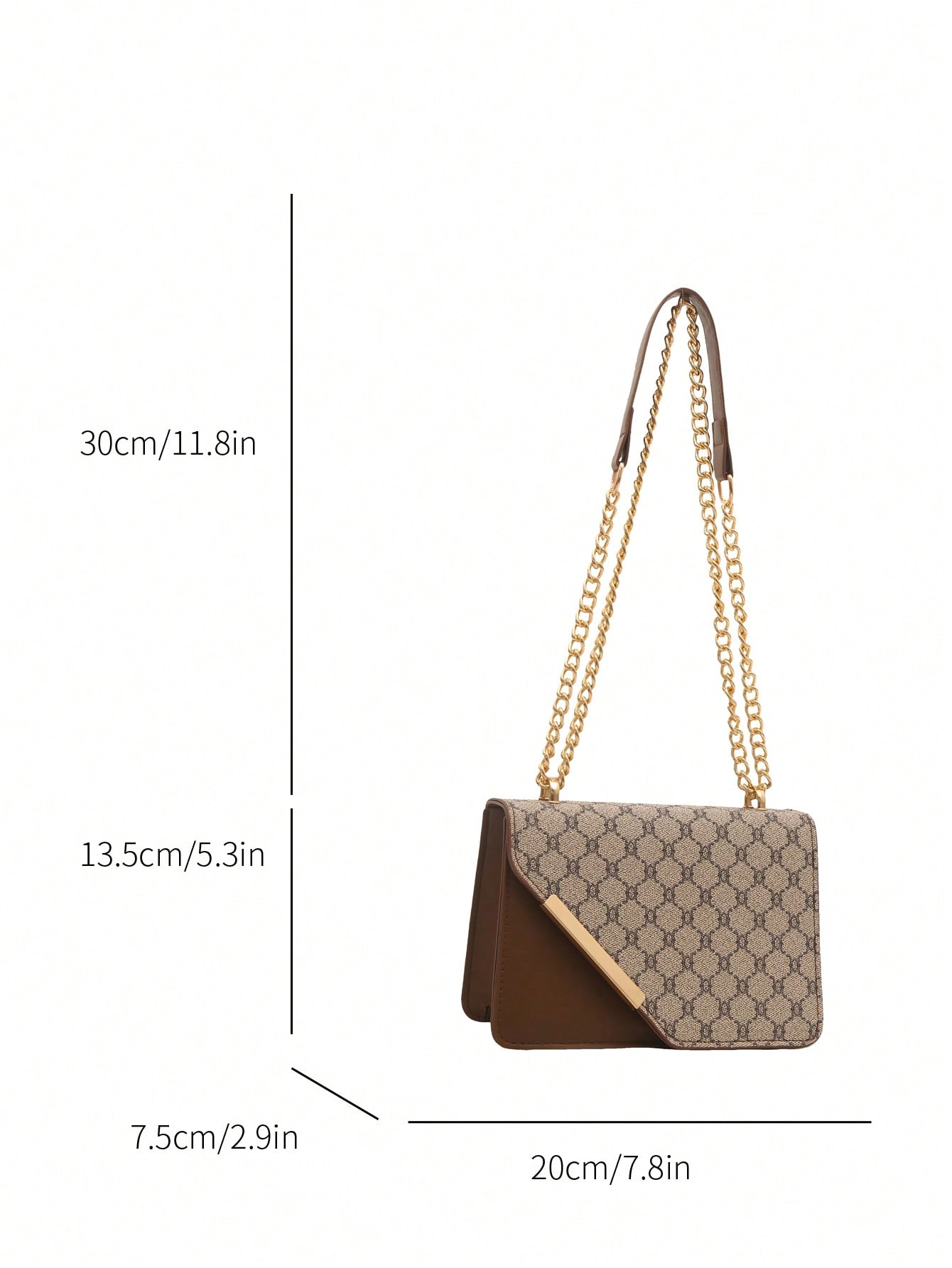 حقيبة ظهر صغيرة بتصميم الكاروهات مع خياطة متباينة بقصة مائلة، حزام كتف معدني، حقيبة كتف مربعة