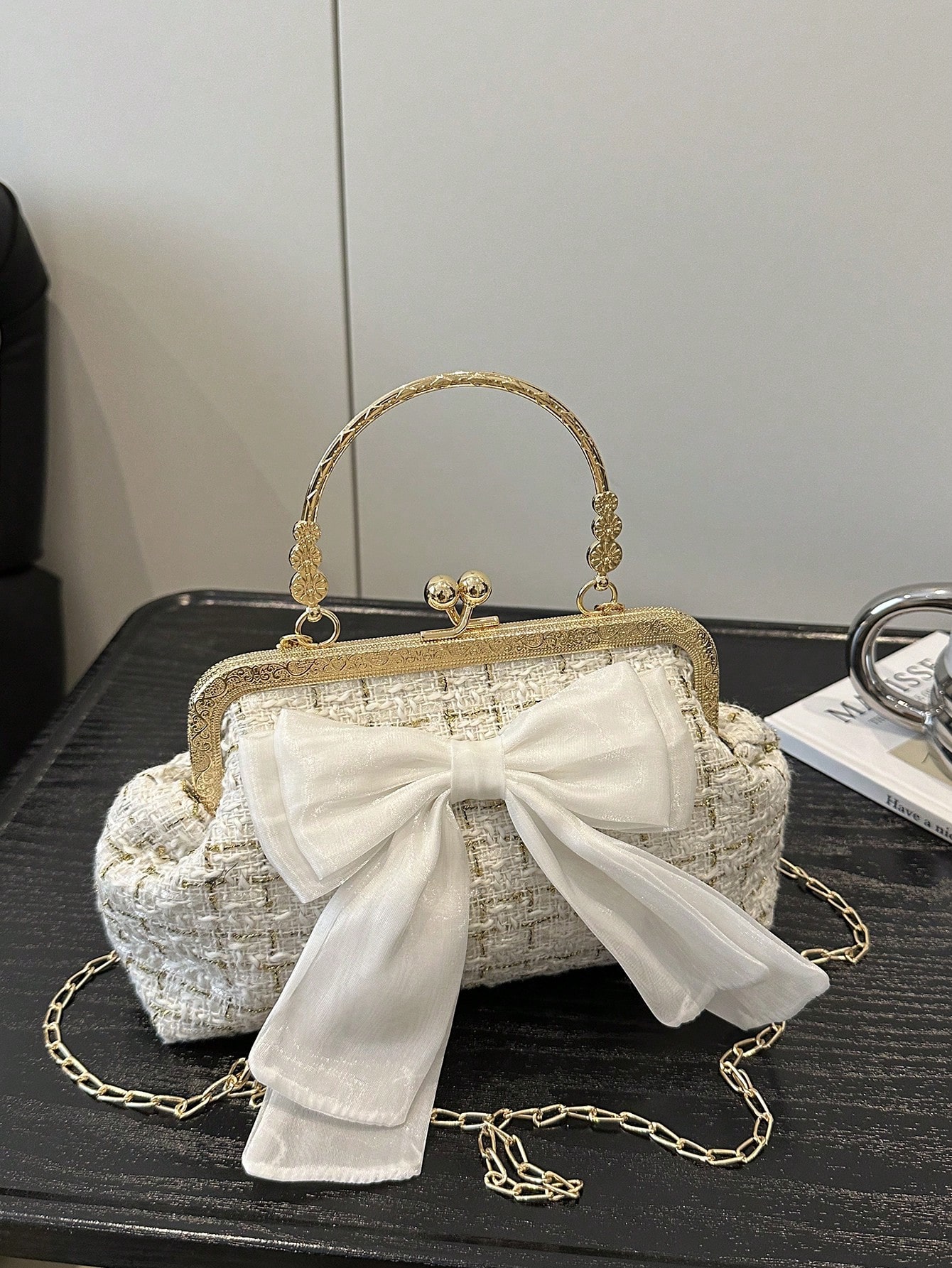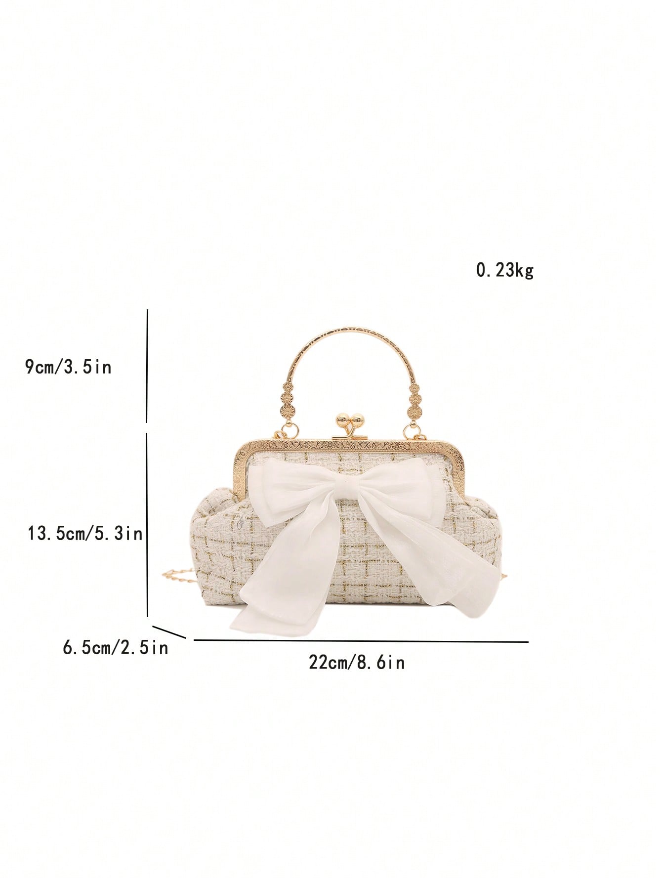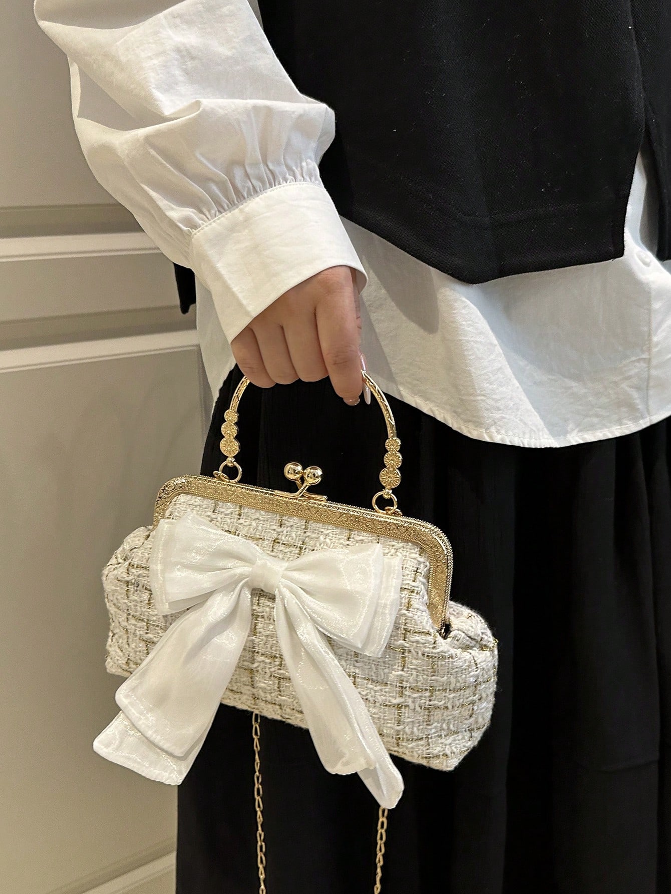 - مقبض السلسلة المعدنية يزيد من أناقة التصميم ويمنح الحقيبة لمسة فاخرة.